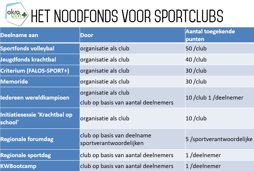 Dan blijft er nog 65% of zo’n 87.500 euro over. Aangezien we weinig jeugd of G-sporters hebben, kiezen we ervoor dat dit bedraag naar de clubs en trefpunten vloeit. Om een deel van de koek te krijgen moet je als club of trefpunt enkele engagementen aangaan, waarbij je minstens 50 punten verzamelt. Op die manier wil OKRA-SPORT+ jullie als club of trefpunt stimuleren om deel te nemen aan bovenlokale initiatieven of projecten, waarmee je de werking opnieuw kunt activeren.