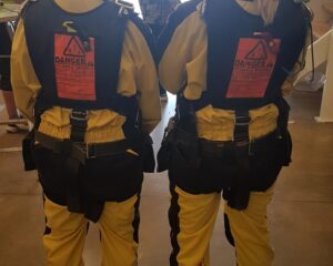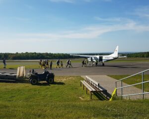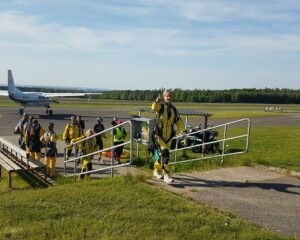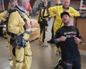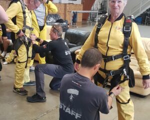 Nadat de vliegpakken werden aangedaan en de harnassen op maat werden afgesteld trokken we richting vliegtuig. Na een vlucht van ongeveer 15 minuten ging het luik open en kon de sprong beginnen. Na een vrije val van 45 seconden opende de parachute en was het gedurende 10 minuten puur genieten van het mooie landschap om nadien zacht te landen in het grasveld.