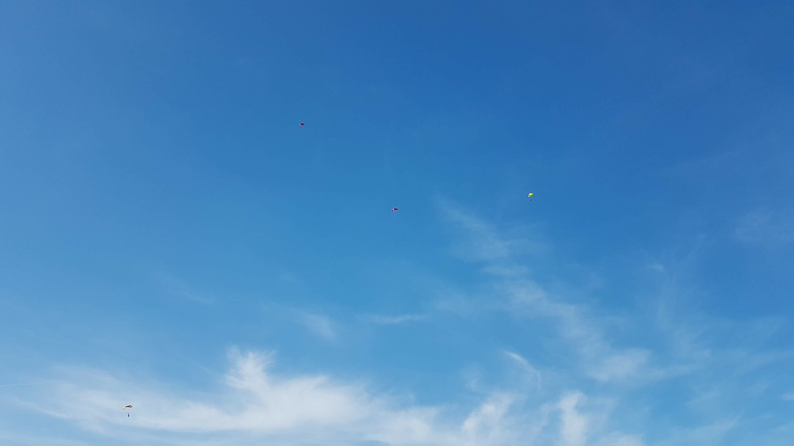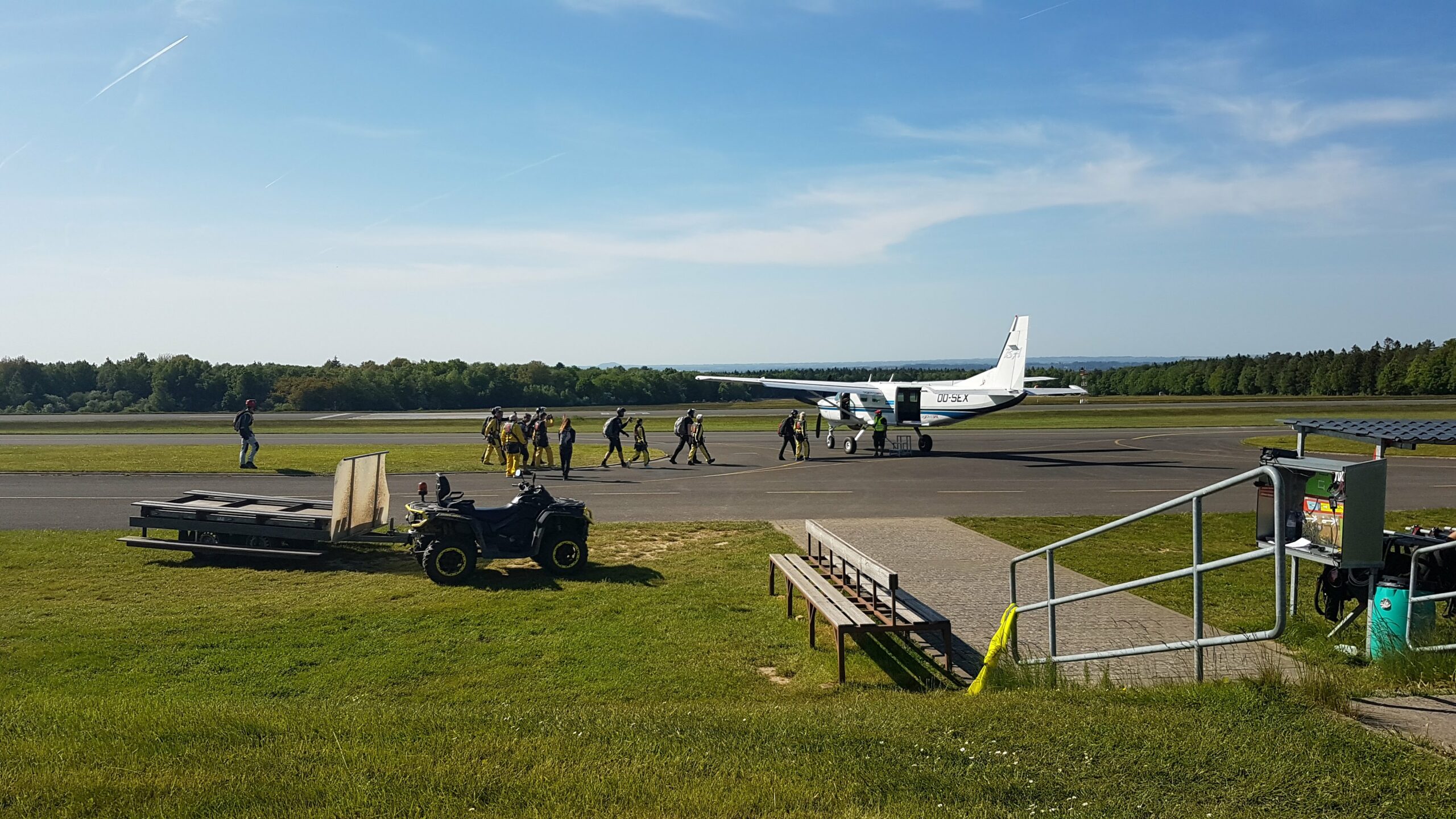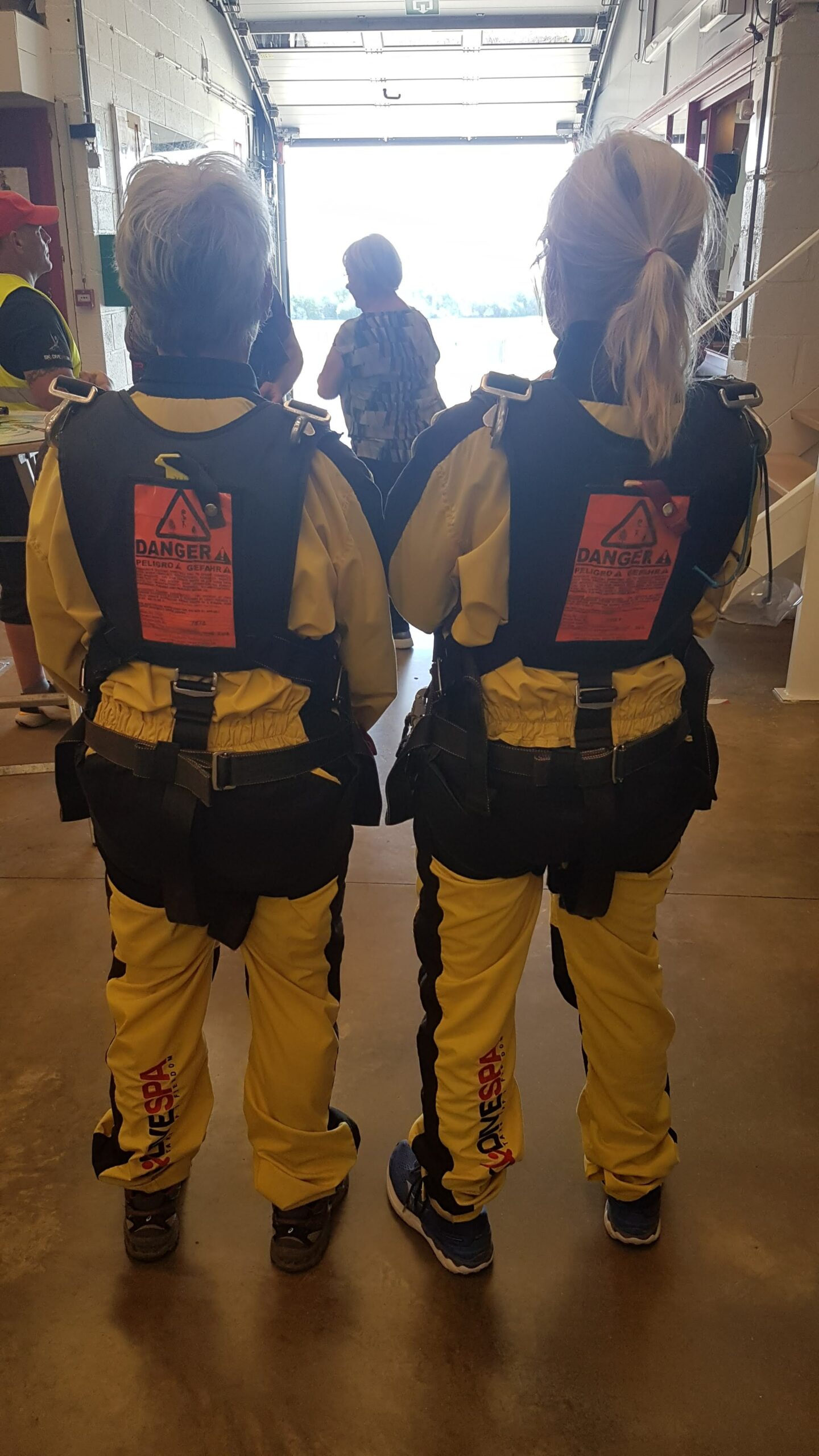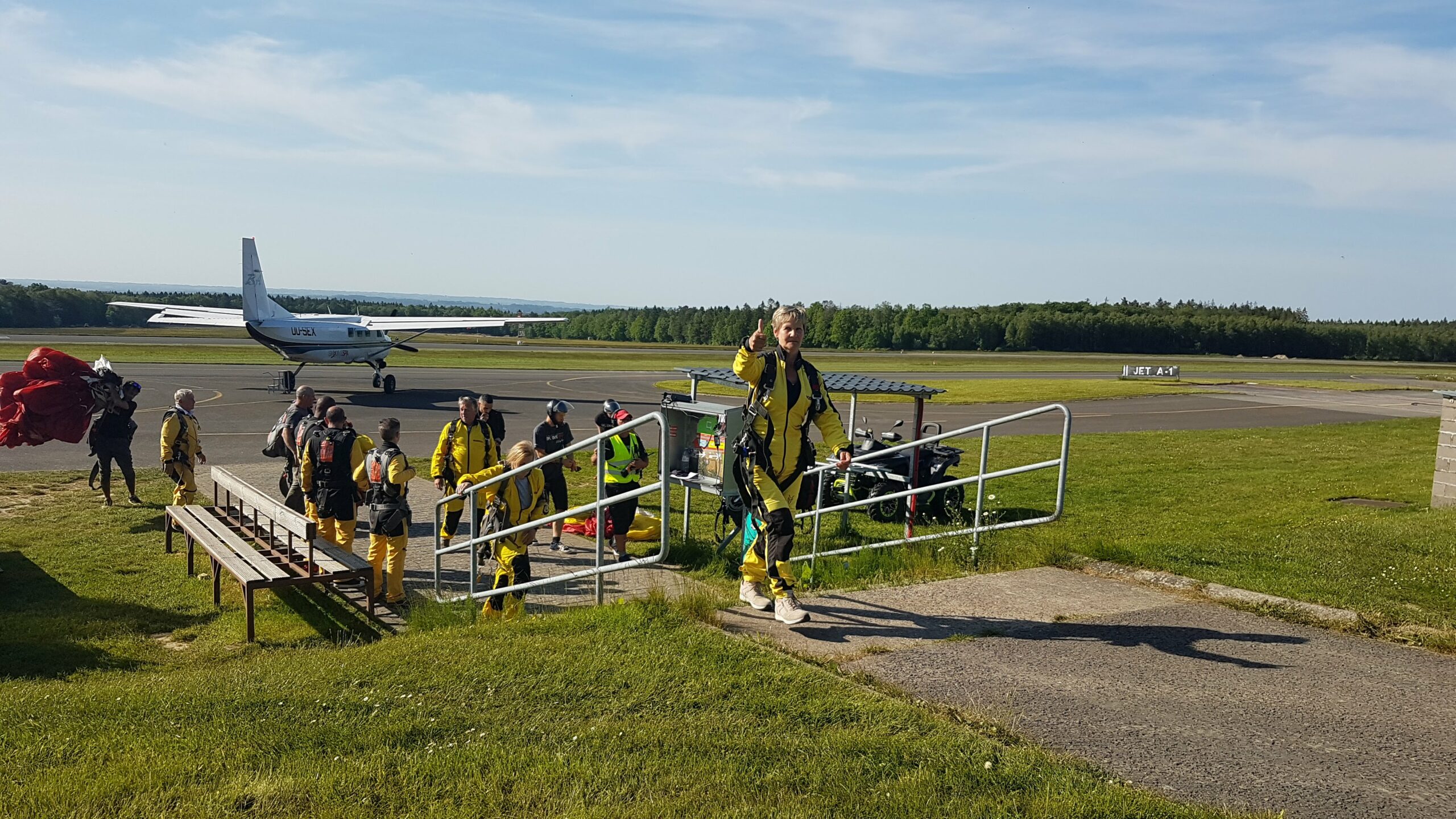 Nadat de vliegpakken werden aangedaan en de harnassen op maat werden afgesteld trokken we richting vliegtuig. Na een vlucht van ongeveer 15 minuten ging het luik open en kon de sprong beginnen. Na een vrije val van 45 seconden opende de parachute en was het gedurende 10 minuten puur genieten van het mooie landschap om nadien zacht te landen in het grasveld.