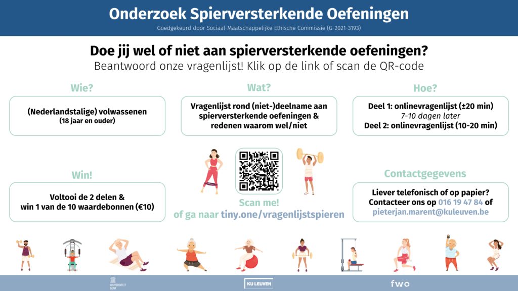 De KULeuven doet momenteel onderzoek. Ze doen dit wel vaker. Dit keer willen ze meer weten over jouw deelname aan spierversterkende oefeningen tijdens je vrije tijd. Spierversterkende oefeningen zijn een ruim begrip. Dit kunnen oefeningen zijn in de fitness zijn, met materiaal zoals dynabands, halters… maar evengoed oefeningen waarbij je je lichaamsgewicht gebruikt zoals pompen, planken…
