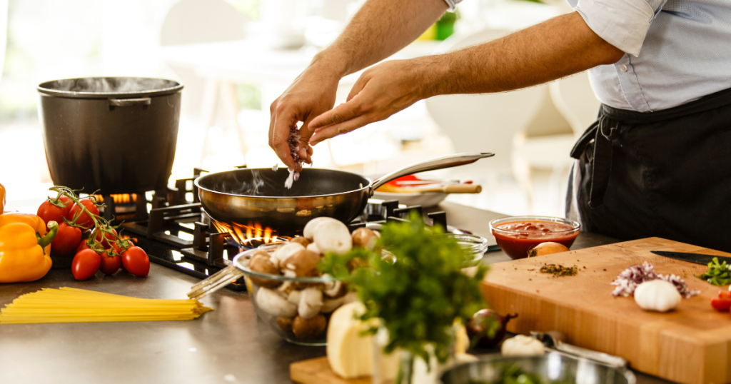 Schouders los schudden: Terwijl je roert in de pan, schud je jouw schouders ritmisch mee op de muziek. Dit ontspant je schouders en nek, die vaak onbewust gespannen zijn.