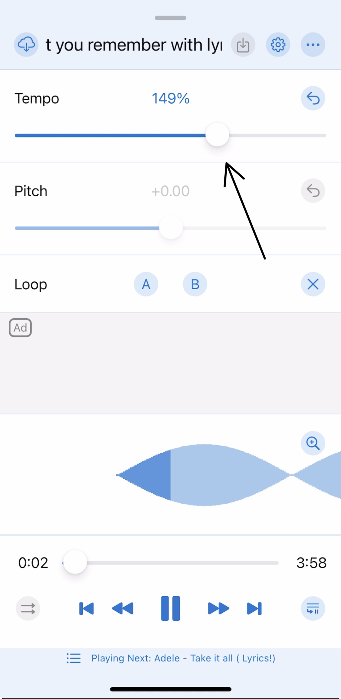- Zowel bij de ‘locked’ als ‘unlocked songs’ kan je een nummer vertragen of versnellen. Dit doe je door op het nummer te klikken. Het nummer begint af te spelen. Als je dan nogmaals op het nummer drukt, verschijnen er balkjes waarmee je de snelheid kan bepalen (uitgedrukt in percentage)