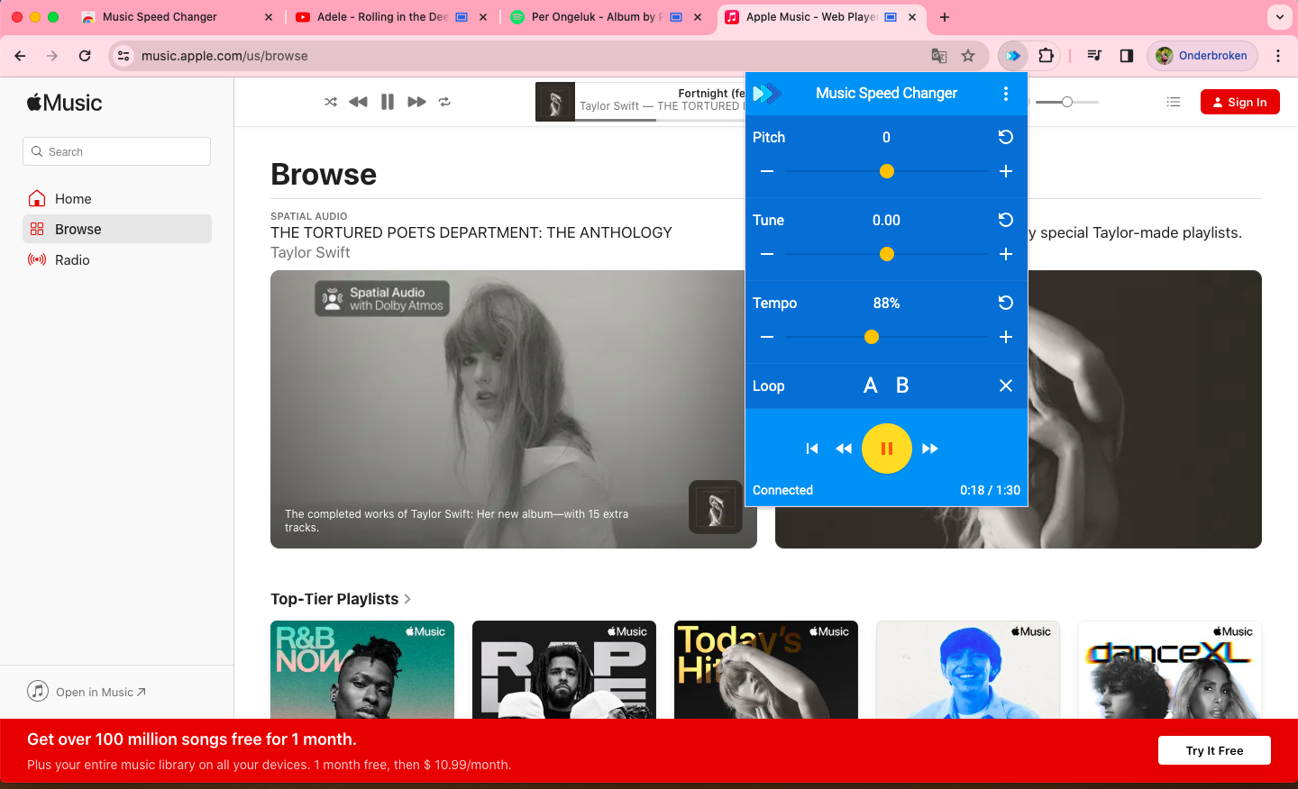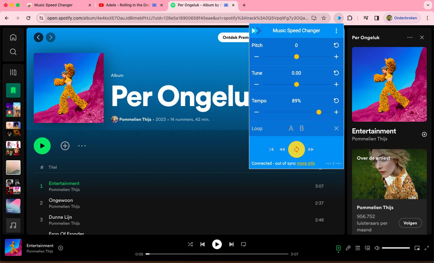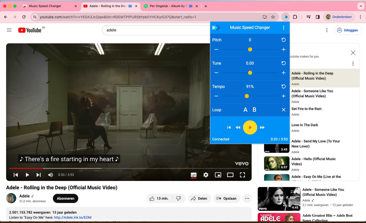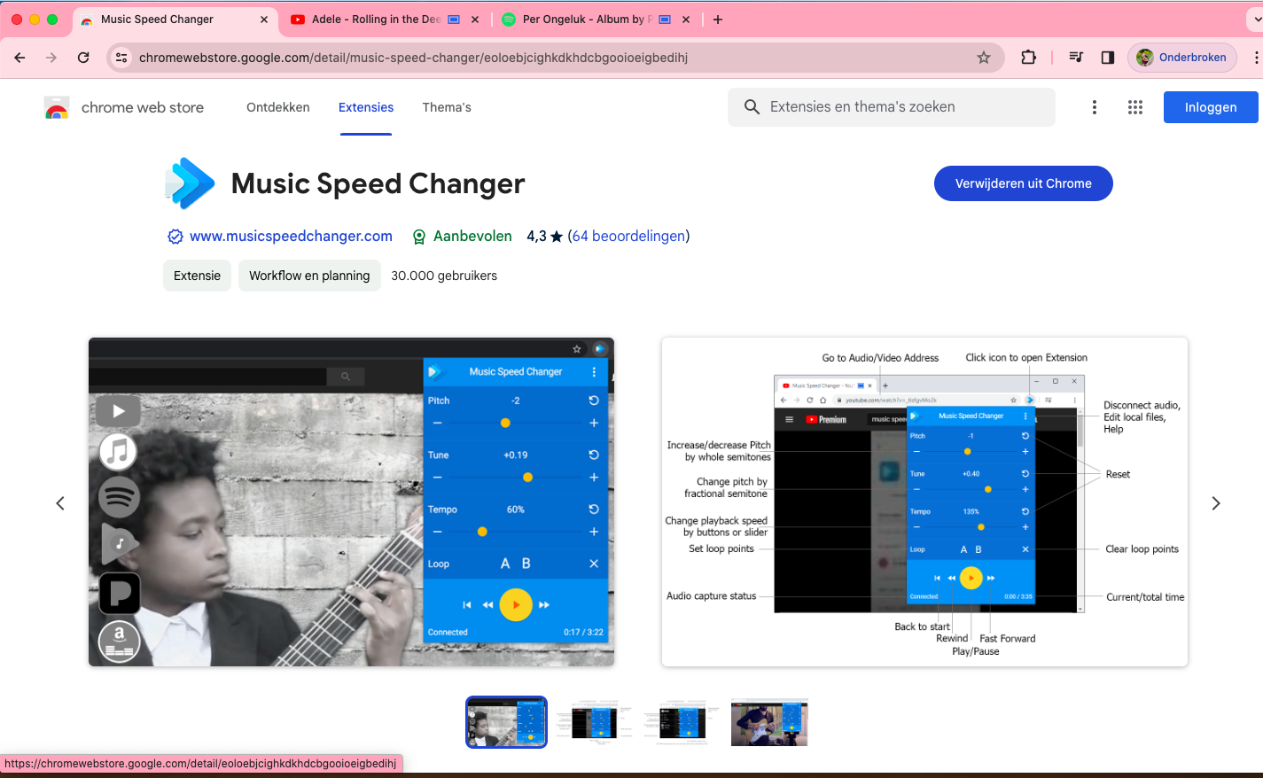 Download deze extensie voor jouw webbrowser Google Chrome of Microsoft Edge. Je kan dan voortaan deze tool terugvinden in jouw werkbalk. Wanneer je nu via het web jouw muziekplatform opent, bvb. Youtube of Spotify, dan kan je via de Music Speed Changer het tempo van de muziek aanpassen terwijl je het afspeelt. Je hebt hiervoor natuurlijk wel internetverbinding nodig. Deze extensie downloaden: Google Chrome: Music Speed Changer – Chrome Web Store (google.com) TIP: Dit is een heel eenvoudige oplossing om muziek te vertragen/versnellen! |