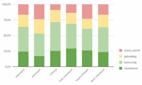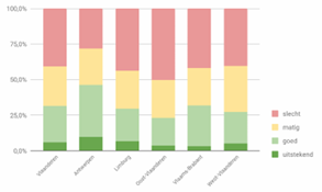 Als we puur kijken naar het comfort van de fietspaden, dan kan men zien dat Oost-Vlaanderen het beste scoort met een score van 29,1%, gevolgd door Vlaams-Brabant (26,1%) en Limburg (25,2%). In de provincie Antwerpen hebben ze zowel de minst “uitstekende” fietspaden als de meest “zeer slecht” beoordeelde fietspaden, dus we kunnen concluderen dat het comfort van fietspaden ondermaats is ten opzichte van de andere provincies.