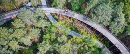 ” Fietsen door de Bomen in het Pijnven in Hechtel-Eksel is een iconische fietsbrug die je laat fietsen tussen de kruinen van de bomen in Bosland. Met deze innovatieve fietsbeleving leggen we een extra belevingslaag op het Limburgse fietsroutenetwerk: dit is dan ook Limburgs’ grootste toeristische troef!