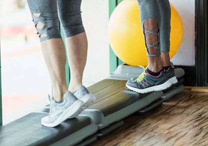- Ga rechtop staan op een verhoog (trap, step,..): voeten naast elkaar