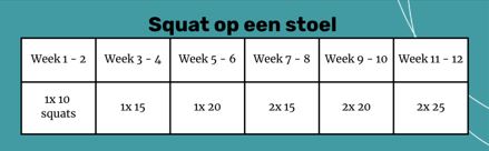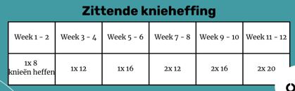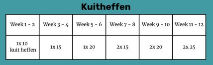 Opbouw: Start met 1x 10 herhalingen –> opbouwen in 12 weken naar 2x 25 herhalingen