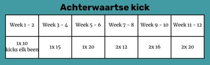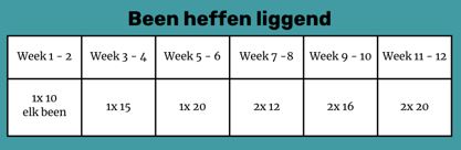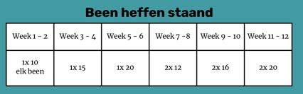 Opbouw: Start met 1x 10 herhalingen van elk been –> opbouwen in 12 weken naar 2x 20