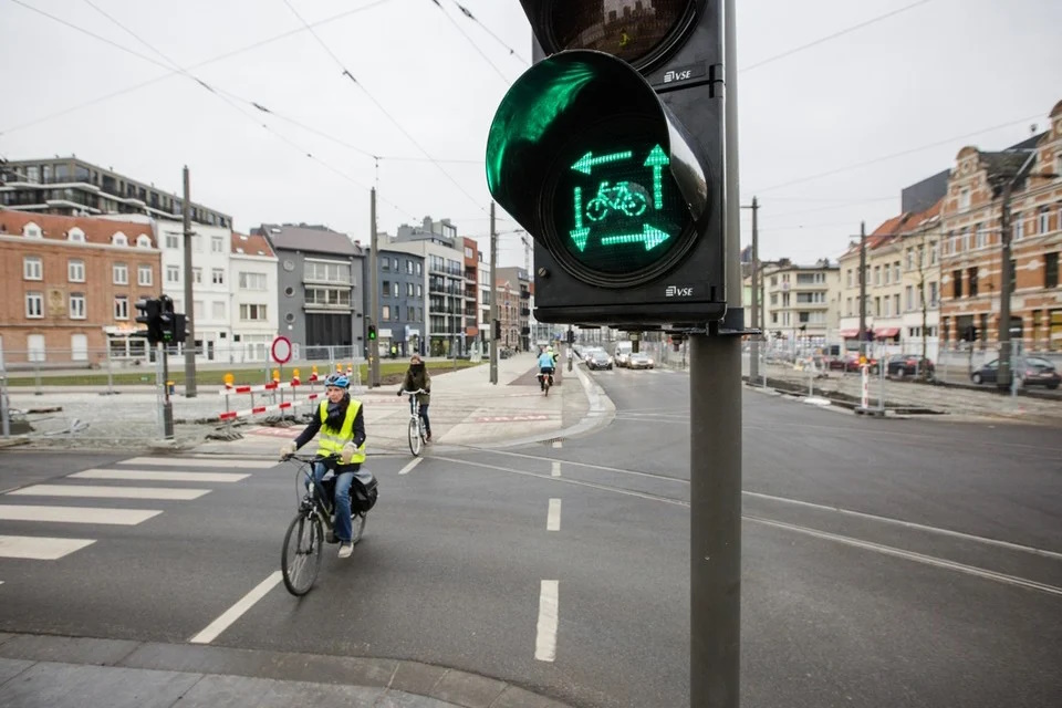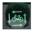 Wanneer het groene, oranjegele of rode fietssilhouet omringd is door pijltjes betekent dit dat gelijktijdig groen, oranjegeel of rood geldt voor de dwarsrichting. Deze lichten gelden uitsluitend voor fietsers en bestuurders van tweewielige bromfietsen indien ze op het fietspad mogen rijden. (art. 61.1, 7°).