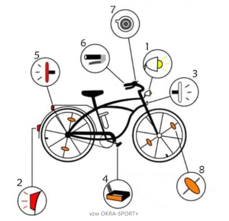 - twee goed functionerende remmen (één op het voorwiel en één op het achterwiel)reflectoren: vooraan wit, achteraan rood (het weerkaatsende deel mag niet samenvallen met het achterlicht), aan weerszijden van de pedalen wit of geel, op de spaken en/of de banden minstens 2 gele of oranje dubbelzijdige reflectoren per wiel; vast bevestigd aan de spaken en symmetrisch aangebracht en/of een witte reflecterende strook aan weerszijden van elke band.