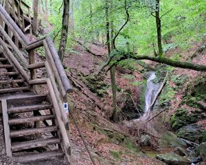 De GR5 naar Fraipont en de GR15 naar Aywaille blijven elkaar volgen tot in Wiplanche. Bij de start van de route duik je na 1,5 km het bos in om er op km 8 even uit te komen in Wiplanche, waar de GR5 en GR15 elk hun eigen richting uitgaan. Ik blijf de GR15 volgen en op km 13 komt het hoogtepunt van deze route: passage langs de Ninglispo, het enige bergriviertje in België waar het gedurende 3 km klimmen en klauteren is. De rotsblokjes liggen er wat glad bij maar uitschuiven is niet aan de orde want ze hebben daar touwen voorzien waar je jou goed aan kan vasthouden. Ondanks het slechte weer passeer ik zeer veel tegenliggers. Dit is natuurlijk ook een zeer gekende trekpleister. Gelukkig dat het dan geen mooi weer was of was het hier een overrompeling… op km 16 kom je aan de parking van de Ninglispo (deze stond overvol) en daar heb je ook de mogelijkheid om iets te eten/drinken in de daarnaast gelegen taverne. Ik laat deze voor wat ze is en wandel verder waar ik meteen op een steile, lange klim wordt getrakteerd. Bovenop de top wacht me een ideale picknickplek met een mooi uitzicht. Het wordt picknicken onder de regendruppels, ook dat heeft zijn charme.