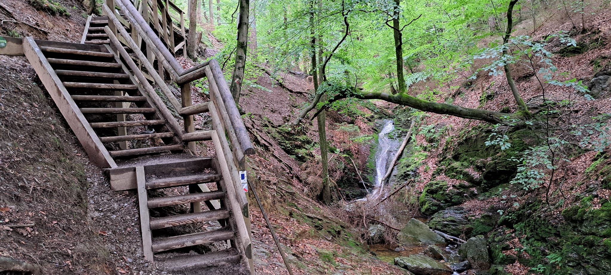 De GR5 naar Fraipont en de GR15 naar Aywaille blijven elkaar volgen tot in Wiplanche. Bij de start van de route duik je na 1,5 km het bos in om er op km 8 even uit te komen in Wiplanche, waar de GR5 en GR15 elk hun eigen richting uitgaan. Ik blijf de GR15 volgen en op km 13 komt het hoogtepunt van deze route: passage langs de Ninglispo, het enige bergriviertje in België waar het gedurende 3 km klimmen en klauteren is. De rotsblokjes liggen er wat glad bij maar uitschuiven is niet aan de orde want ze hebben daar touwen voorzien waar je jou goed aan kan vasthouden. Ondanks het slechte weer passeer ik zeer veel tegenliggers. Dit is natuurlijk ook een zeer gekende trekpleister. Gelukkig dat het dan geen mooi weer was of was het hier een overrompeling… op km 16 kom je aan de parking van de Ninglispo (deze stond overvol) en daar heb je ook de mogelijkheid om iets te eten/drinken in de daarnaast gelegen taverne. Ik laat deze voor wat ze is en wandel verder waar ik meteen op een steile, lange klim wordt getrakteerd. Bovenop de top wacht me een ideale picknickplek met een mooi uitzicht. Het wordt picknicken onder de regendruppels, ook dat heeft zijn charme.