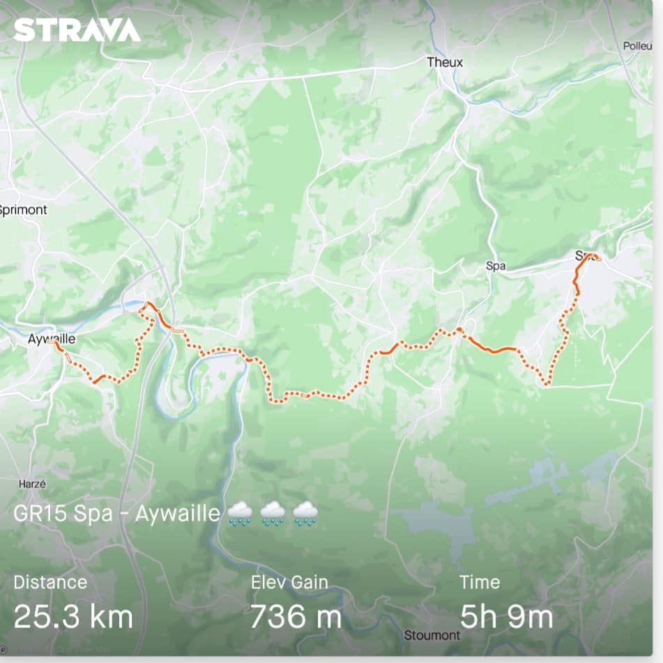 Om 9u00 vertrokken in Spa. Vanuit Spa heb je ook heel wat GR routes (GR 5 naar Fraipont, GR5 naar Stavelot, GR573 naar Pepinster, GR573 naar Botrange, GR15 naar Eupen en de GR15 naar Aywaille). Ik kies voor de GR15 naar Aywaille. Die heb ik al 2x gedaan een paar jaar geleden maar blijft 1 van mijn favoriete GR routes.