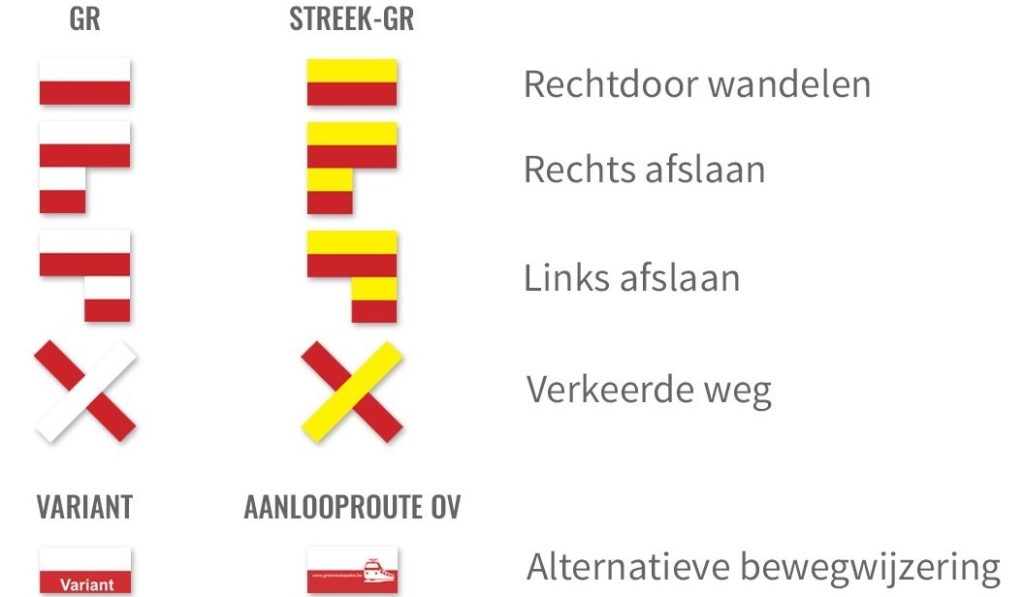 Tijd om op pad te gaan! De basismarkering bestaat uit twee strepen onder elkaar: wit-rood of geel-rood. Dit is een internationale wijze van markeren. Deze markeringen zie je op paaltjes, bomen, muren of andere beschikbare dragers en kom je vooral tegen bij splitsingen en kruispunten. Op deze plaatsen wordt ook het kruisteken gebruikt, dit is om aan te tonen dat je die weg niet moet volgen. Het afslagteken wijst op een richtingsverandering. Je kan een GR in twee richtingen stappen, zo kan je zelf kiezen waar je start- en eindpunt ligt. De topogids, de markering in het veld en de gpx-track ondersteunen elkaar. Indien een situatie ter plaatse gewijzigd is, volg dan steeds de streepjes.
