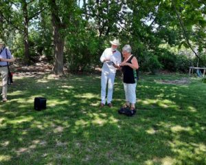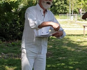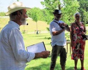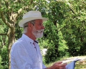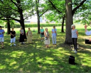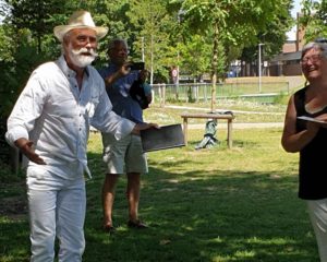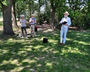 Verteller van dienst, Godfried Kippers, nam de deelnemers mee op tocht in het vernieuwde Kapermolenpark. Hij hield regelmatig halt op een schaduwrijke plek om een luchtig verhaal te vertellen. Naast bestaande cursiefjes van o.a. Louis Verbeeck bracht hij zelf gemaakte teksten. Hij nodigde af en toe een deelnemer uit om samen met hem voor te lezen.