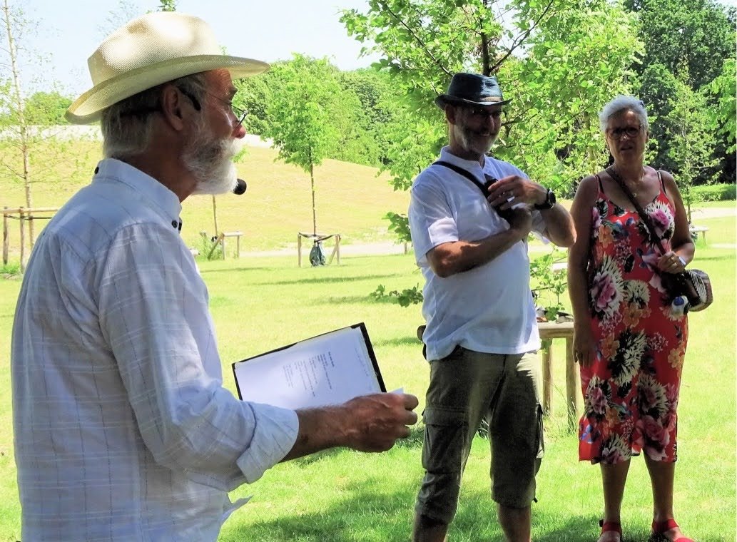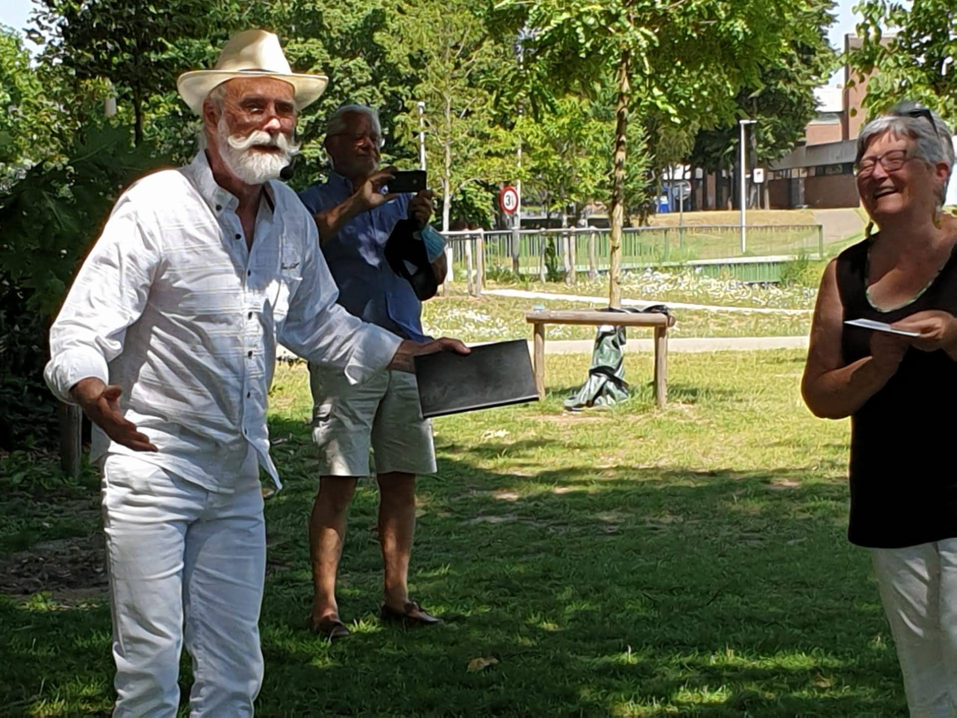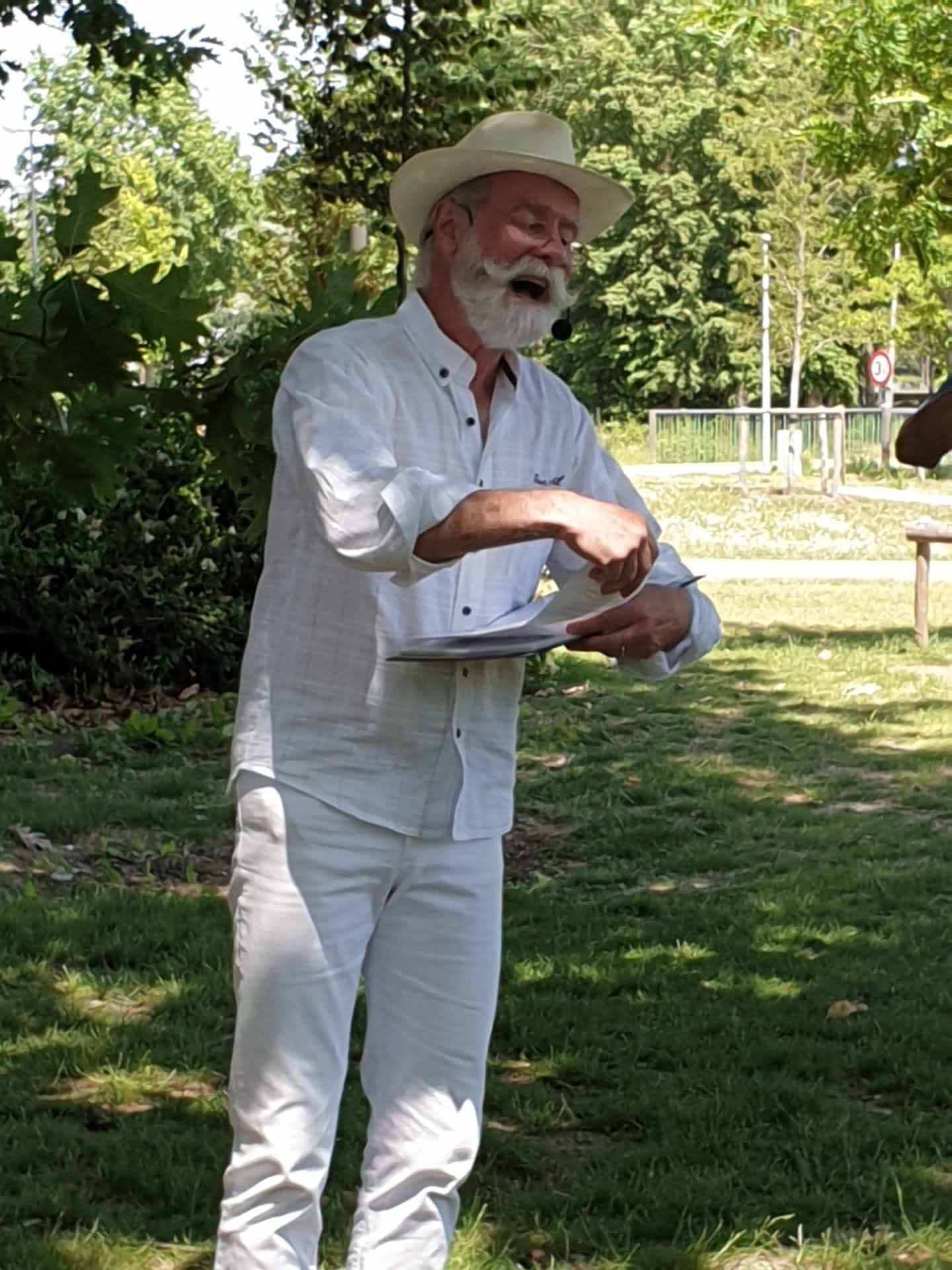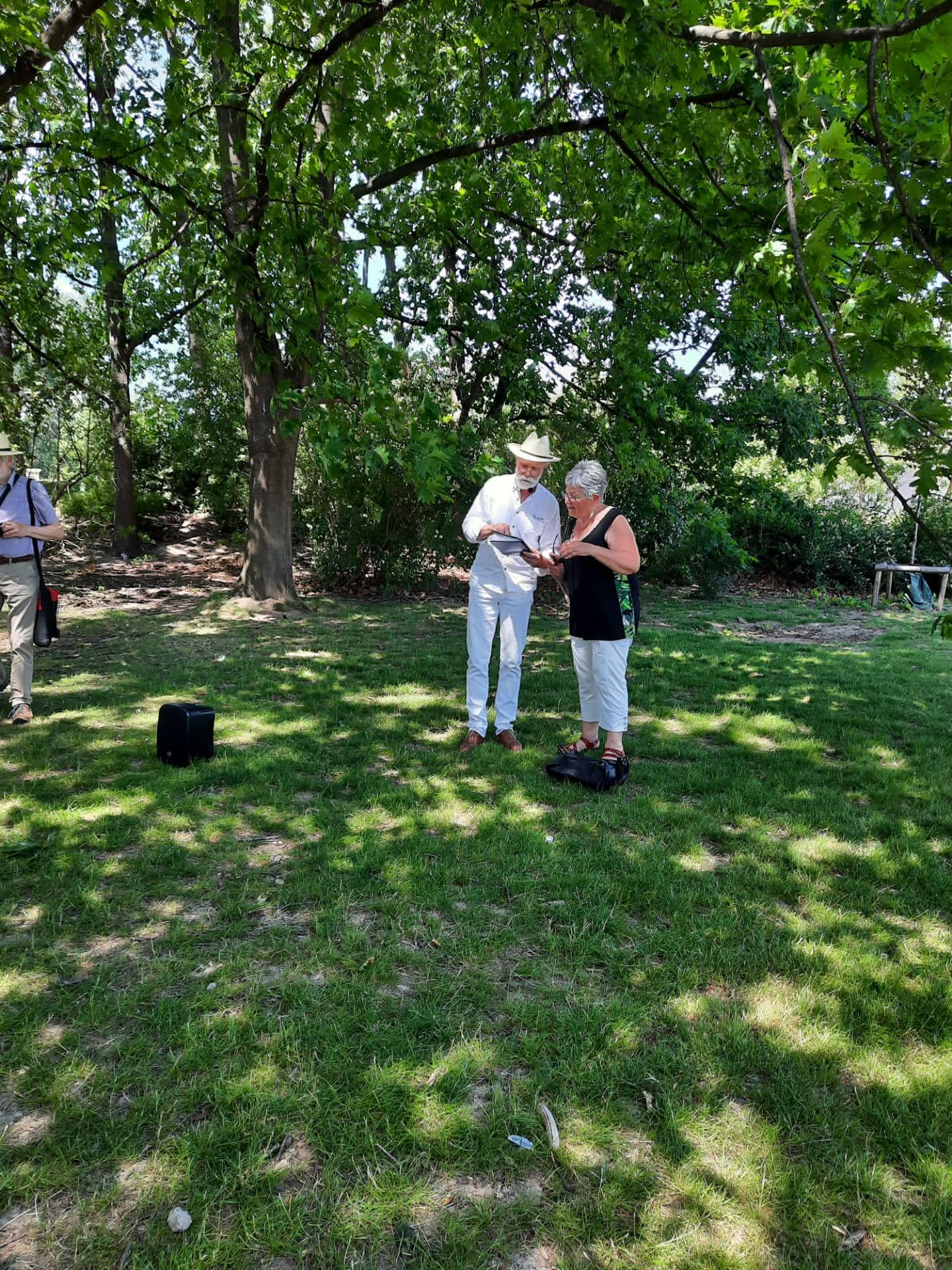 Verteller van dienst, Godfried Kippers, nam de deelnemers mee op tocht in het vernieuwde Kapermolenpark. Hij hield regelmatig halt op een schaduwrijke plek om een luchtig verhaal te vertellen. Naast bestaande cursiefjes van o.a. Louis Verbeeck bracht hij zelf gemaakte teksten. Hij nodigde af en toe een deelnemer uit om samen met hem voor te lezen.