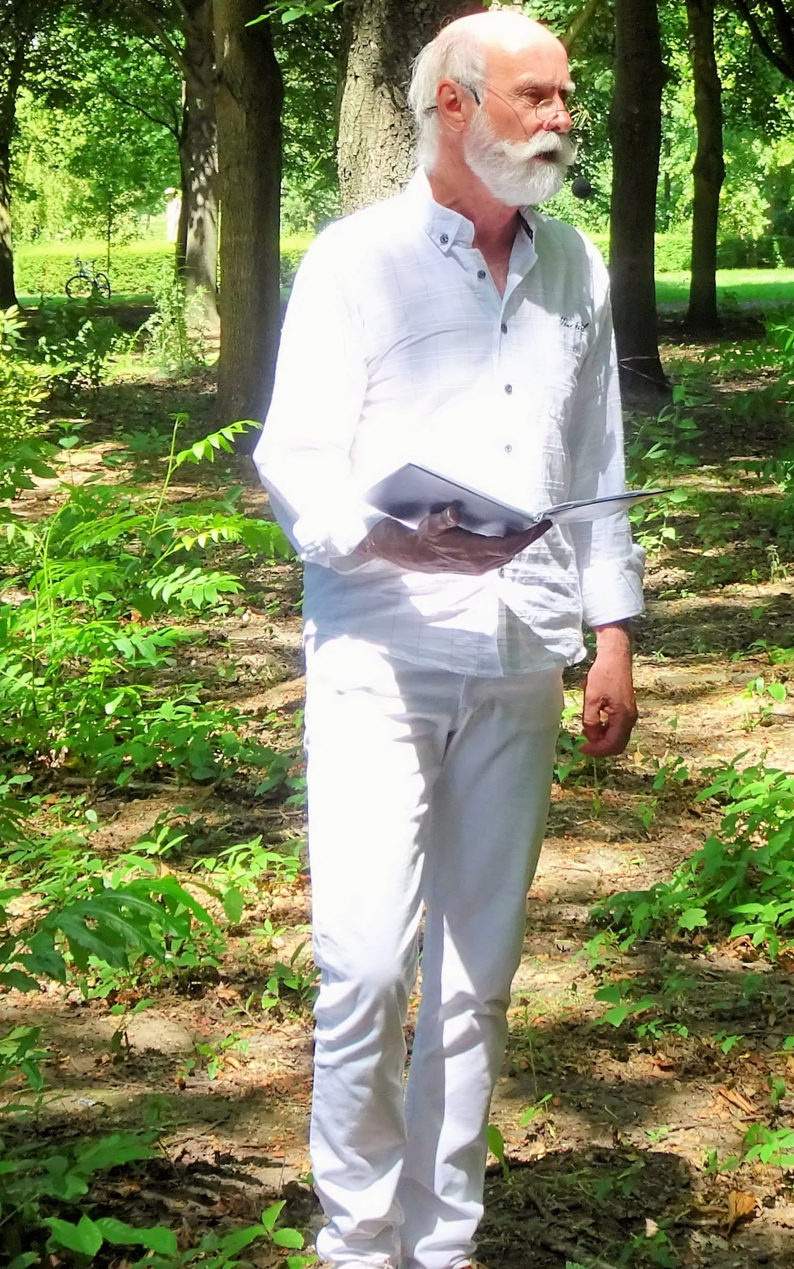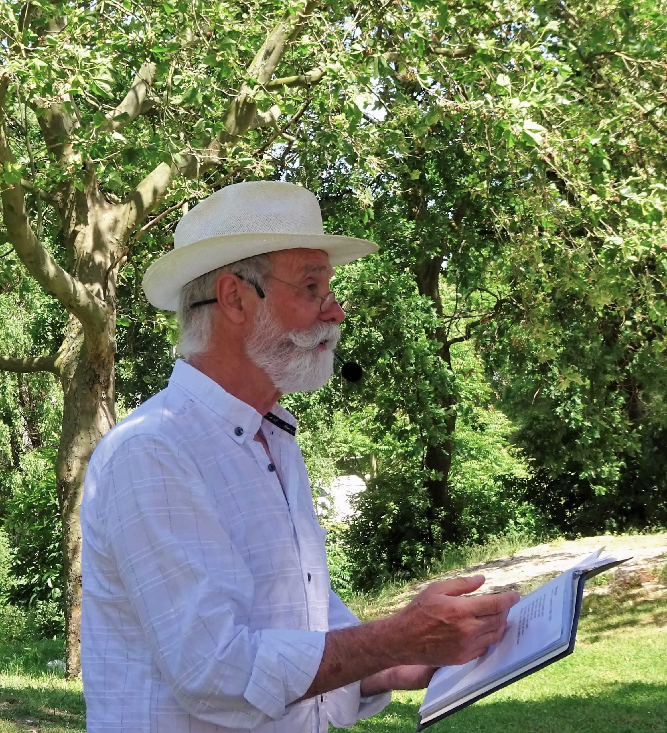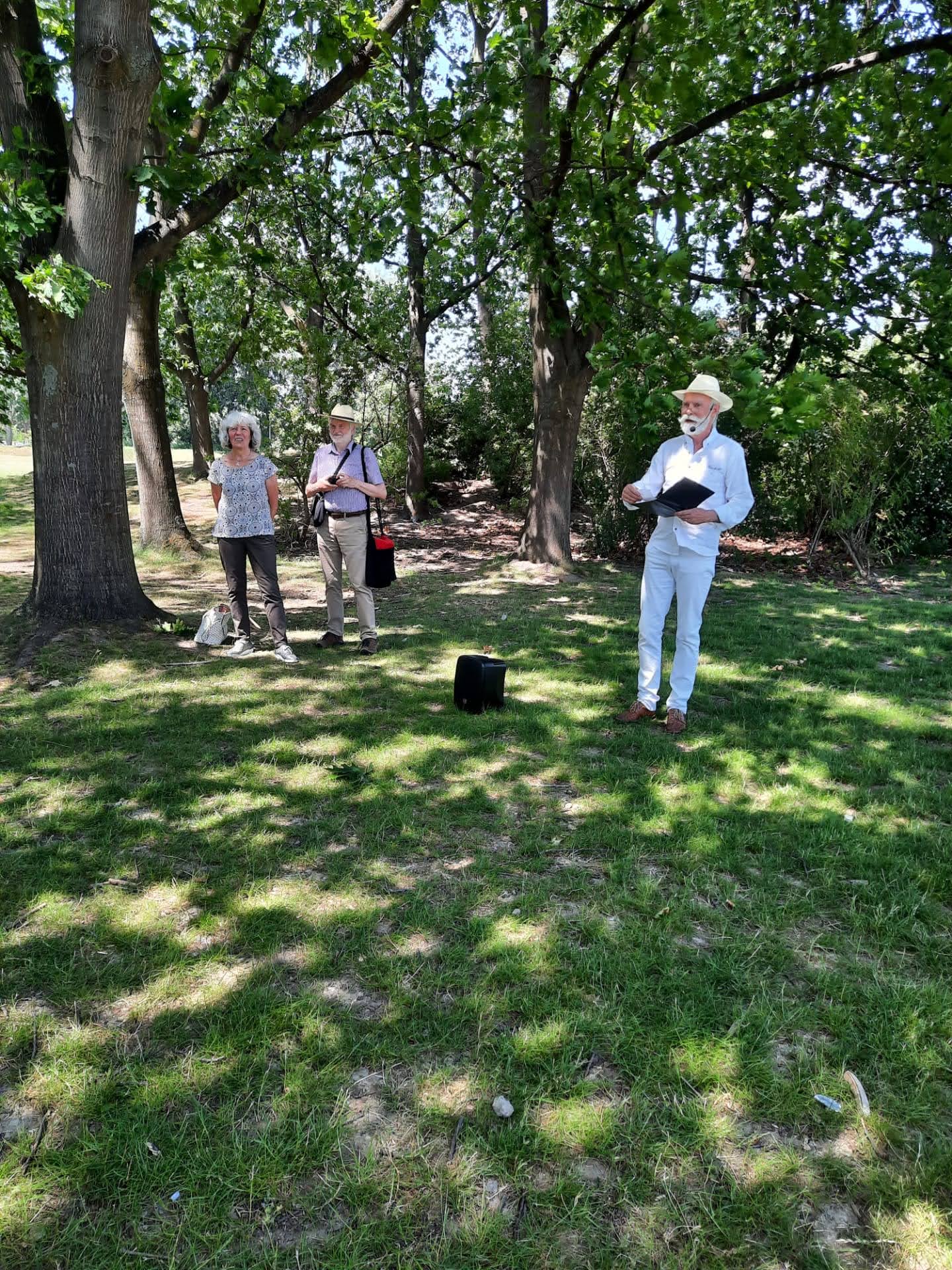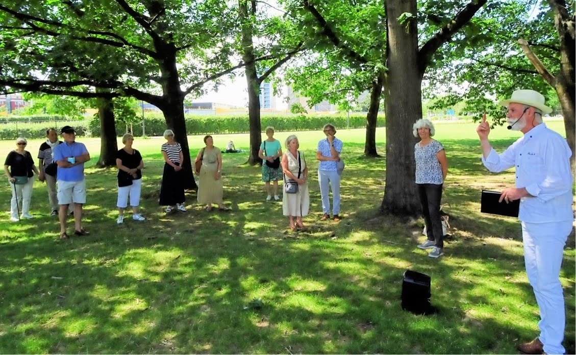 Verteller van dienst, Godfried Kippers, nam de deelnemers mee op tocht in het vernieuwde Kapermolenpark. Hij hield regelmatig halt op een schaduwrijke plek om een luchtig verhaal te vertellen. Naast bestaande cursiefjes van o.a. Louis Verbeeck bracht hij zelf gemaakte teksten. Hij nodigde af en toe een deelnemer uit om samen met hem voor te lezen.