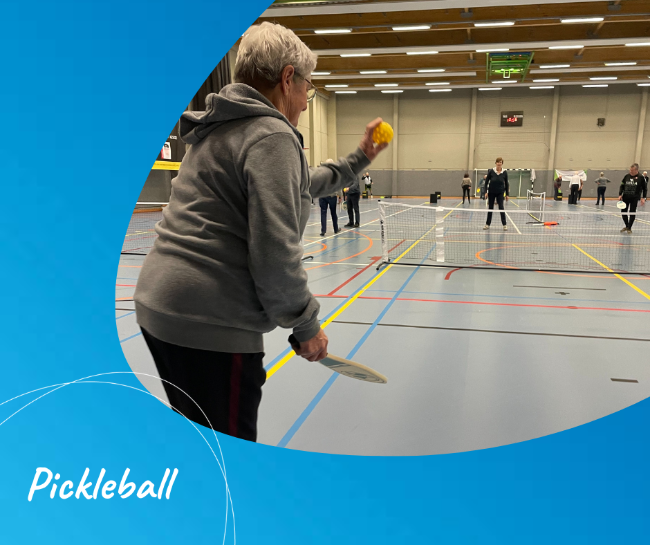 Pickleball is een combinatie van badminton, tafeltennis en tennis. Je speelt pickleball op een klein badmintonveld met een verlaagd net en je gebruikt een lichte bal met gaten. Het racket dat je gebruikt, lijkt een beetje op een padelracket, maar het heeft geen gaten. Je kan pickleball zowel binnen als buiten spelen. Je kan het spel 1 tegen 1 of 2 tegen 2 spelen.